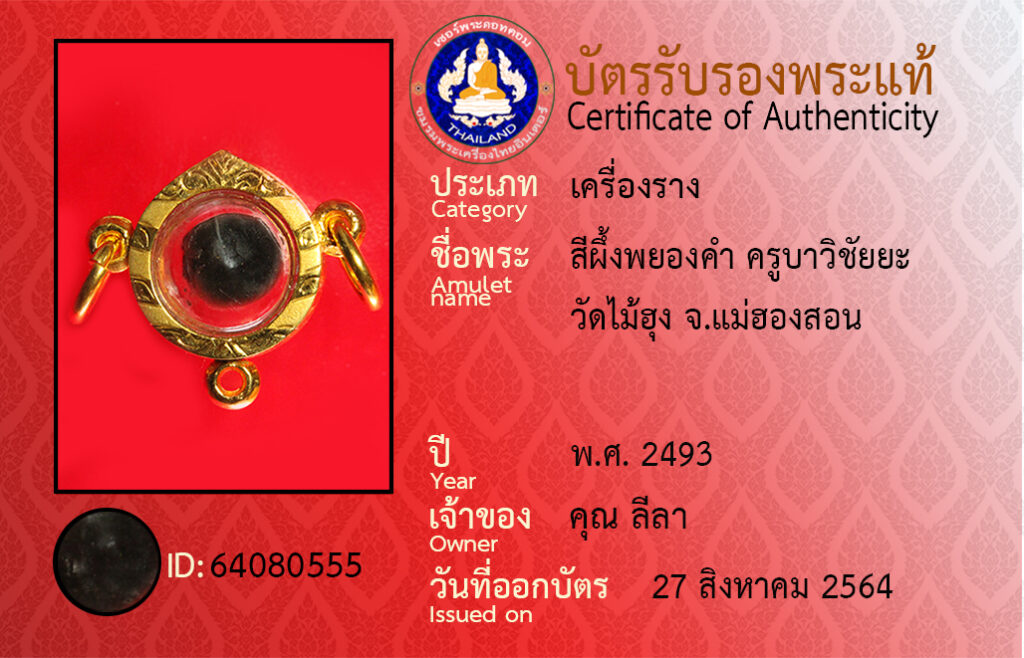 ชื่อพระ : สีผึ้งพยองคำ ครูบาวิชัยยะ วัดไม้ฮุง จ.แม่ฮองสอน