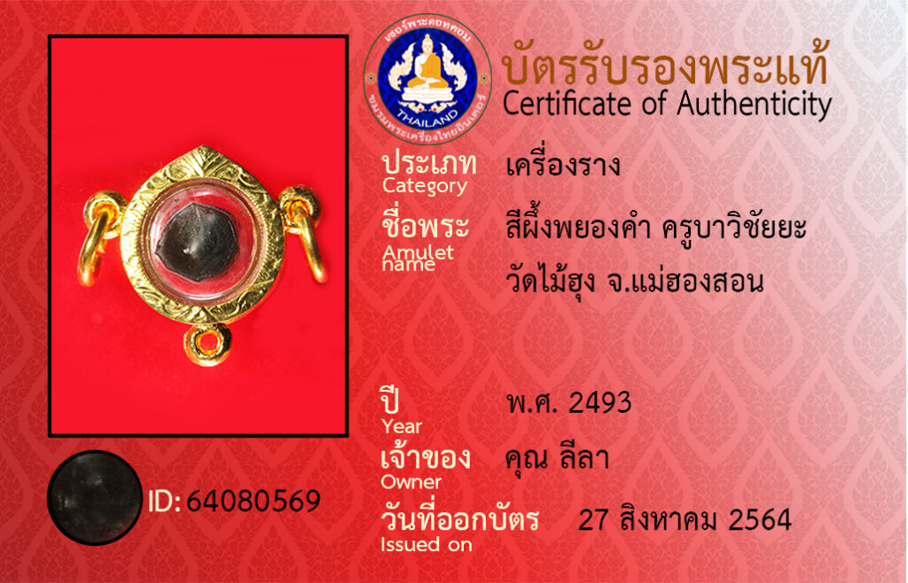 ชื่อพระ : สีผึ้งพยองคำ ครูบาวิชัยยะ วัดไม้ฮุง จ.แม่ฮองสอน