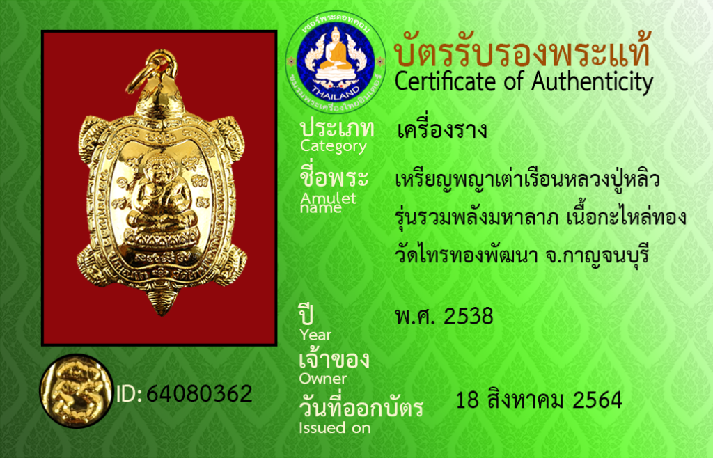 Amulet name : Rian Phaya Tao Ruean LuangPu Lio ,Run Ruam Phon Ngom HaLap , Nuea Ka Lai Thong ,Wat Saithong Phatthana,Kanchanaburi