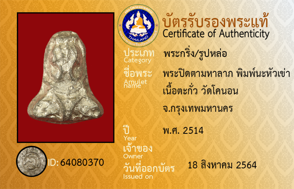 Amulet name : Phra Pit Tam HaLap , Phim Na Hua Khao, Nuea Takua , Wat Kho Non, Krungthepmahanakhon