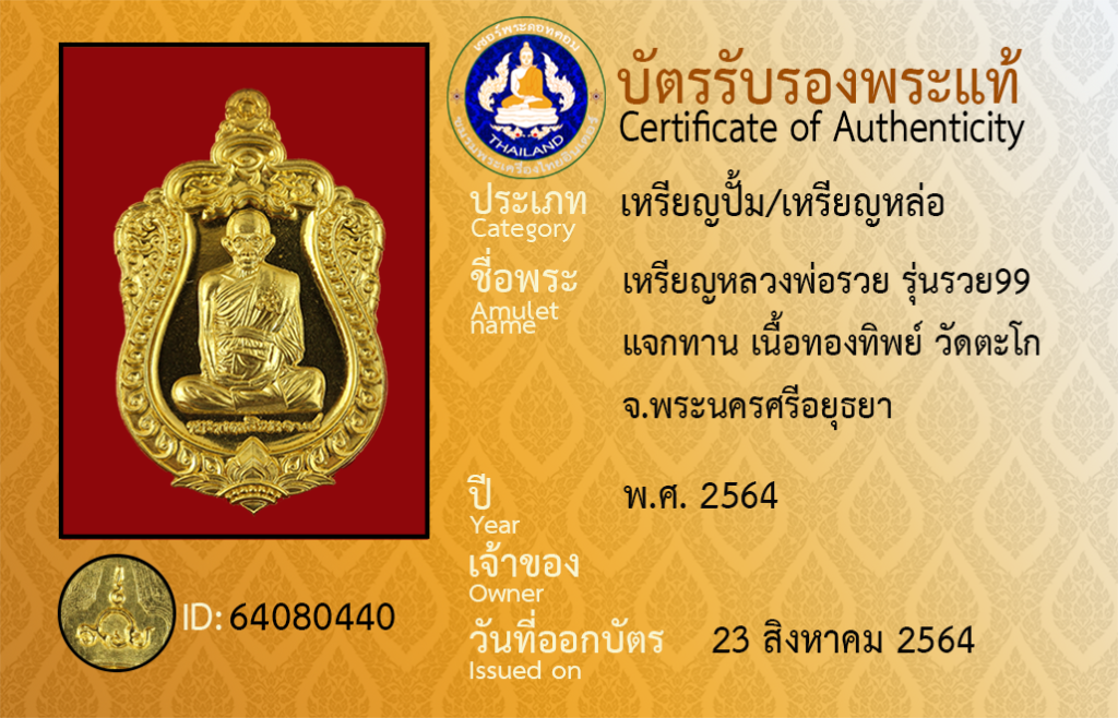 Amulet name : Rian Luang Pho Ruai,Run Ruai [99], Chaek Than, Nuea ThongThip, Wat Tako, Phra Nakhon Si Ayutthaya