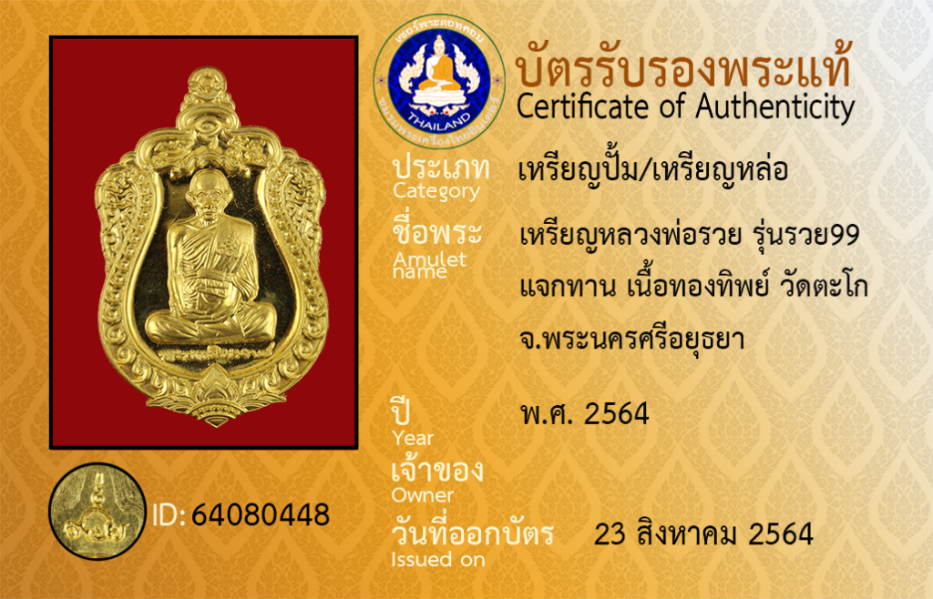 Amulet name : Rian Luang Pho Ruai,Run Ruai [99], Chaek Than, Nuea ThongThip, Wat Tako, Phra Nakhon Si Ayutthaya