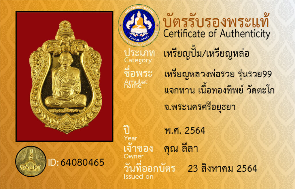Amulet name : Rian Luang Pho Ruai,Run Ruai [99], Chaek Than, Nuea ThongThip, Wat Tako, Phra Nakhon Si Ayutthaya