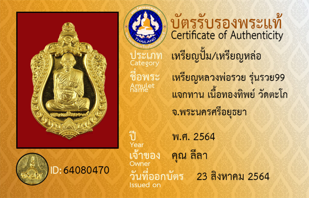 Amulet name : Rian Luang Pho Ruai,Run Ruai [99], Chaek Than, Nuea ThongThip, Wat Tako, Phra Nakhon Si Ayutthaya