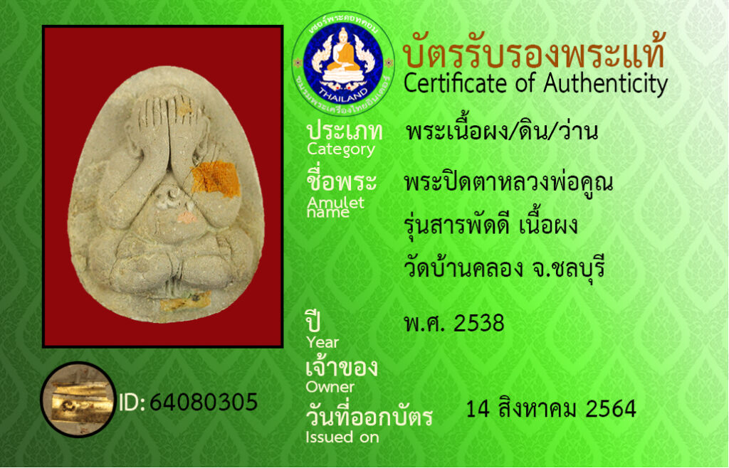 Amulet name : Phra Pit Ta Luang Pho Khun ,Run Saraphat Di ,Wat Ban Khlong ,Chon Buri