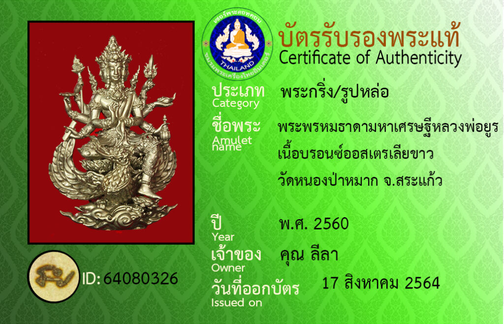 ชื่อพระ : พระพรหมธาดามหาเศรษฐีหลวงพ่อยูร เนื้อเทวฤทธิ์น้ำผึ้งแดงองค์ทองลำอู่ วัดหนองป่าหมาก จ.สระแก้ว