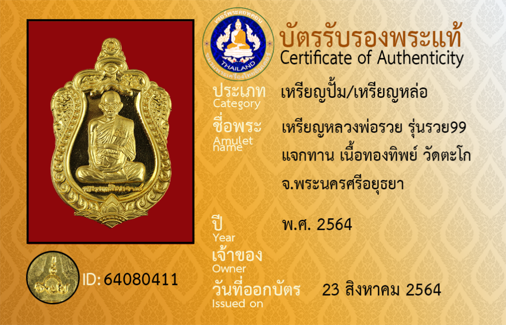 Amulet name : Rian Luang Pho Ruai,Run Ruai [99], Chaek Than, Nuea ThongThip, Wat Tako, Phra Nakhon Si Ayutthaya