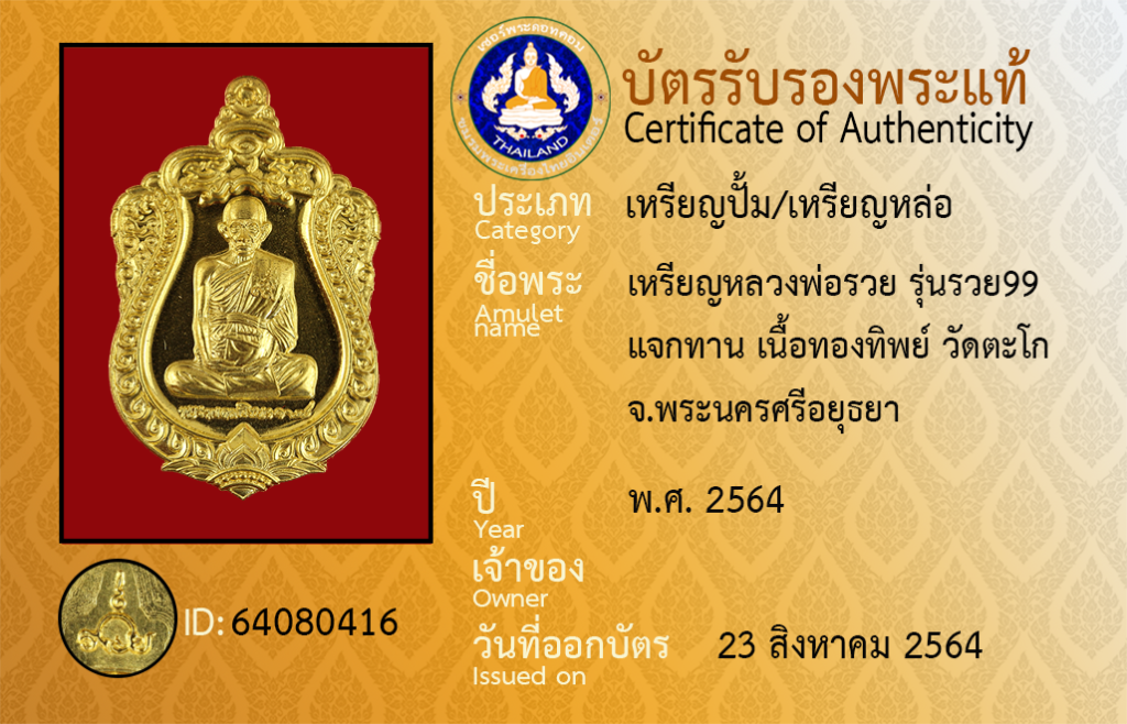 Amulet name : Rian Luang Pho Ruai,Run Ruai [99], Chaek Than, Nuea ThongThip, Wat Tako, Phra Nakhon Si Ayutthaya