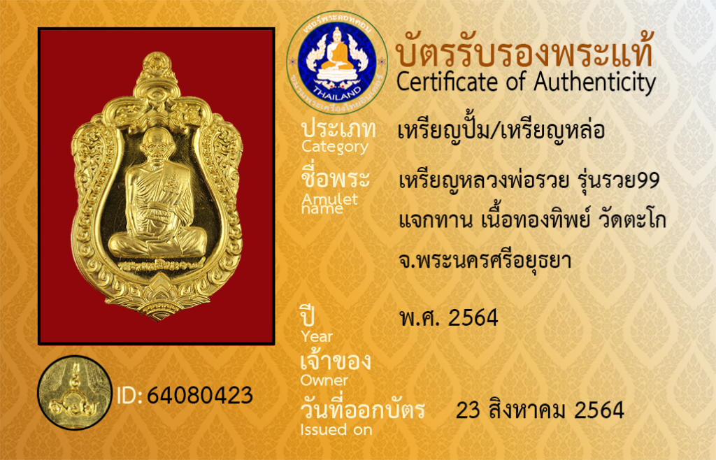 ชื่อพระ : เหรียญหลวงพ่อรวย รุ่นรวย99 แจกทาน เนื้อทองทิพย์ วัดตะโก จ.พระนครศรีอยุธยา