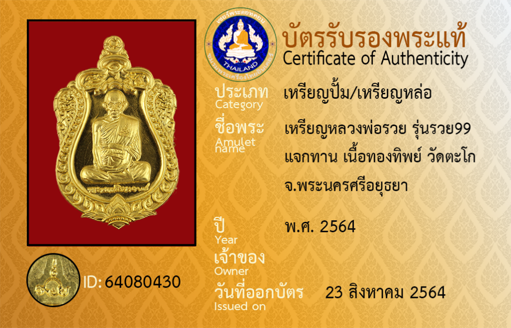 Amulet name : Rian Luang Pho Ruai,Run Ruai [99], Chaek Than, Nuea ThongThip, Wat Tako, Phra Nakhon Si Ayutthaya