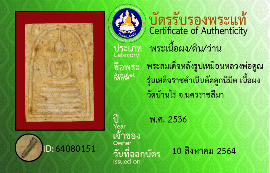 Amulet name : Phra Somdet Lang Rup Muean Luang Pho Khun, Run Sadet Rat Damnoen Tat LukNimit ,Wat Ban Rai, Nakhon Ratchasima