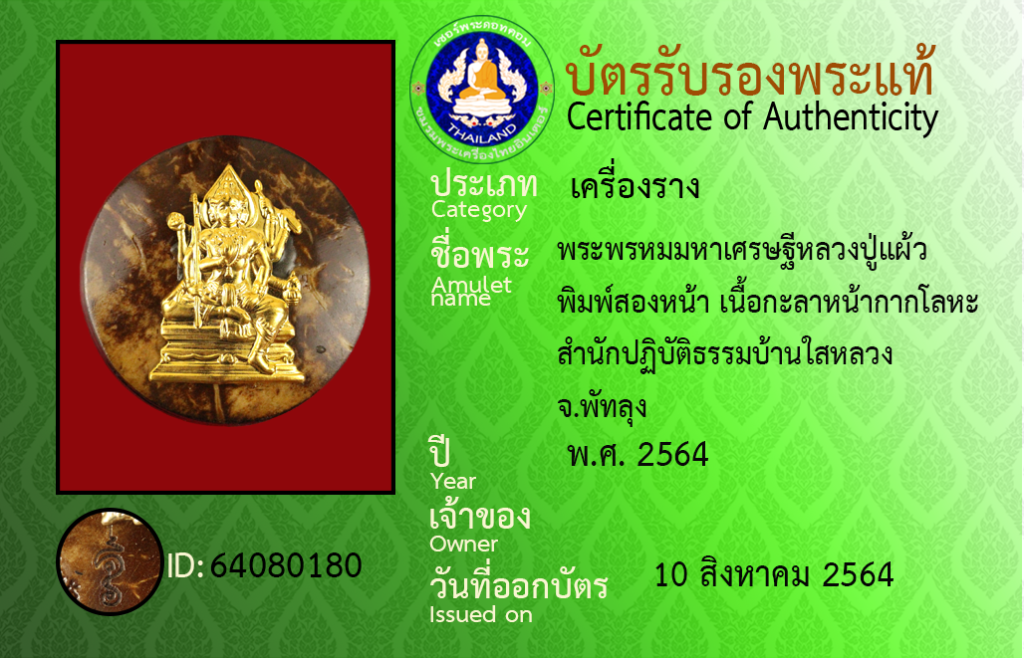 ชื่อพระ : พระพรหมมหาเศรษฐีหลวงปู่แผ้ว พิมพ์สองหน้า เนื้อกะลาหน้ากากโลหะ สำนักปฏิบัติธรรมบ้านใสหลวง จ.พัทลุง