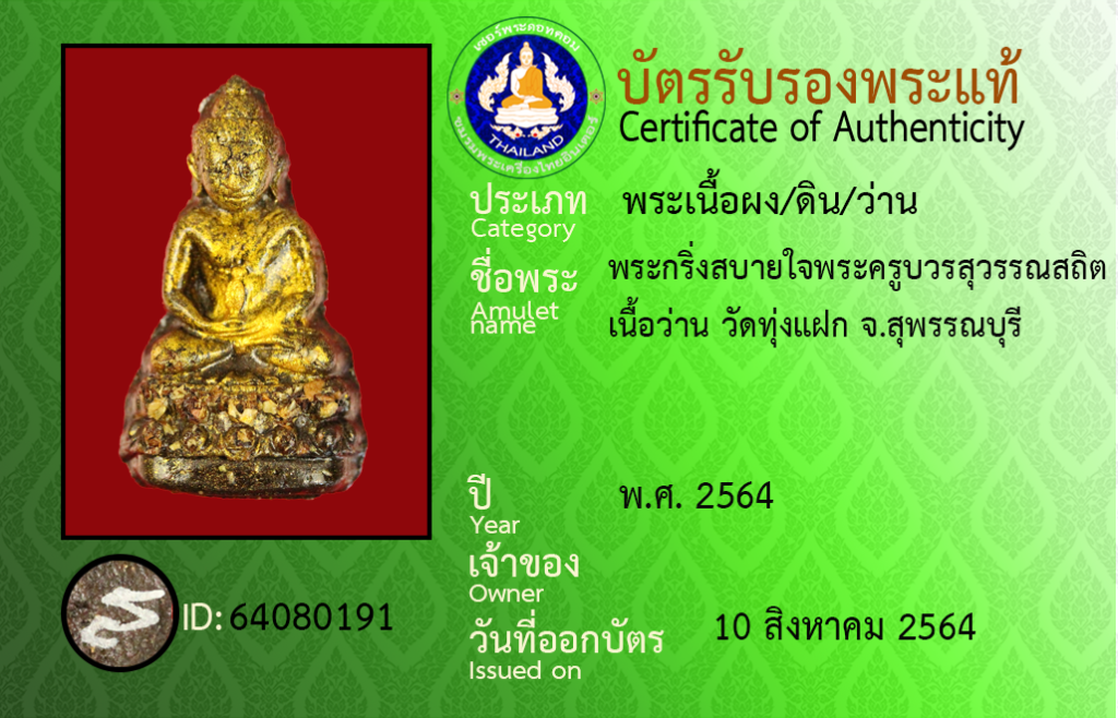 Amulet name : Phra Kring Sabaichai ,Phrakhru Bawon Suwan Sathit, wat Thung Faek,Suphan Buri