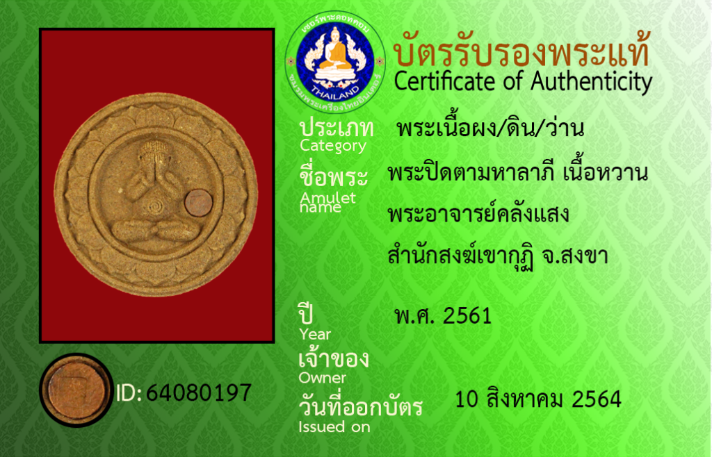 Amulet name : Phra Pit Tam Ha La Phi Phra Achan Khlang Saeng,Samnaksong Khao Kuti, Songkhla