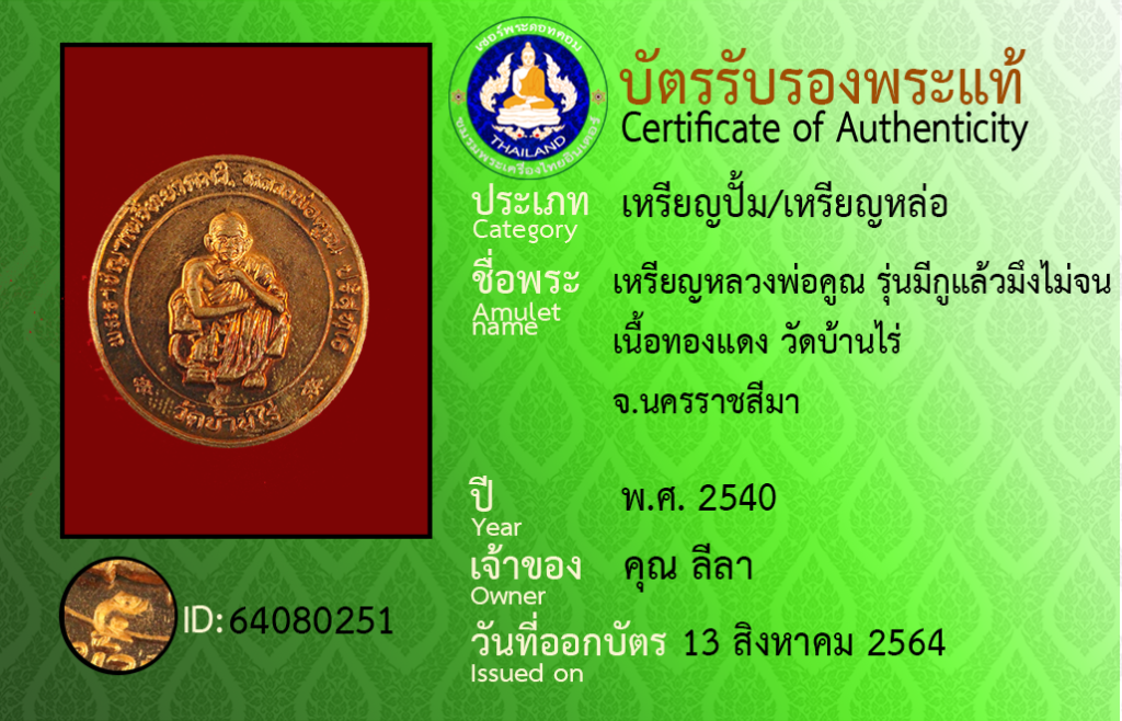 佛牌名称 : 龙婆坤“有我在你不会穷”自身 红铜材质 泰国瓦班莱寺 那空拉差斯玛 佛历2540年