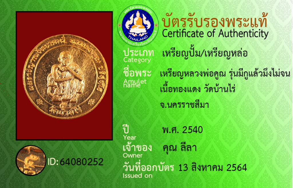 Amulet name : PRian Luang Pho Khun, Run Mi Ku Laeo Mueng Mai Chon,Wat Ban Rai ,Nakhon Ratchasima