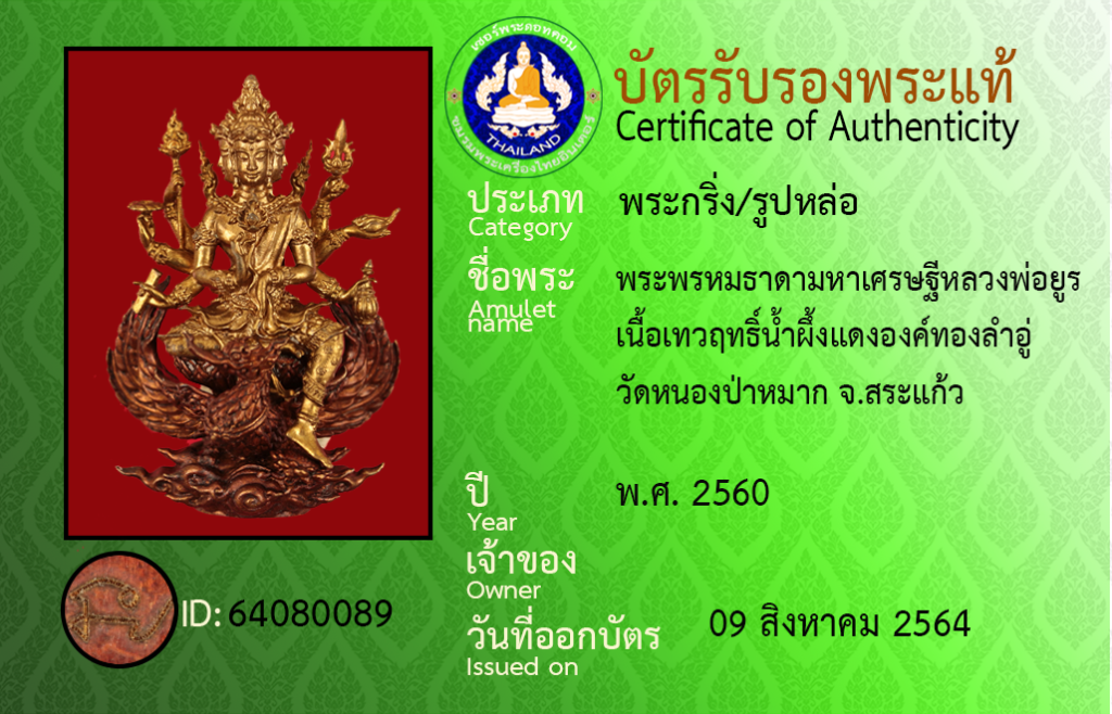 ชื่อพระ : พระพรหมธาดามหาเศรษฐีหลวงพ่อยูร เนื้อเทวฤทธิ์น้ำผึ้งแดงองค์ทองลำอู่ วัดหนองป่าหมาก จ.สระแก้ว