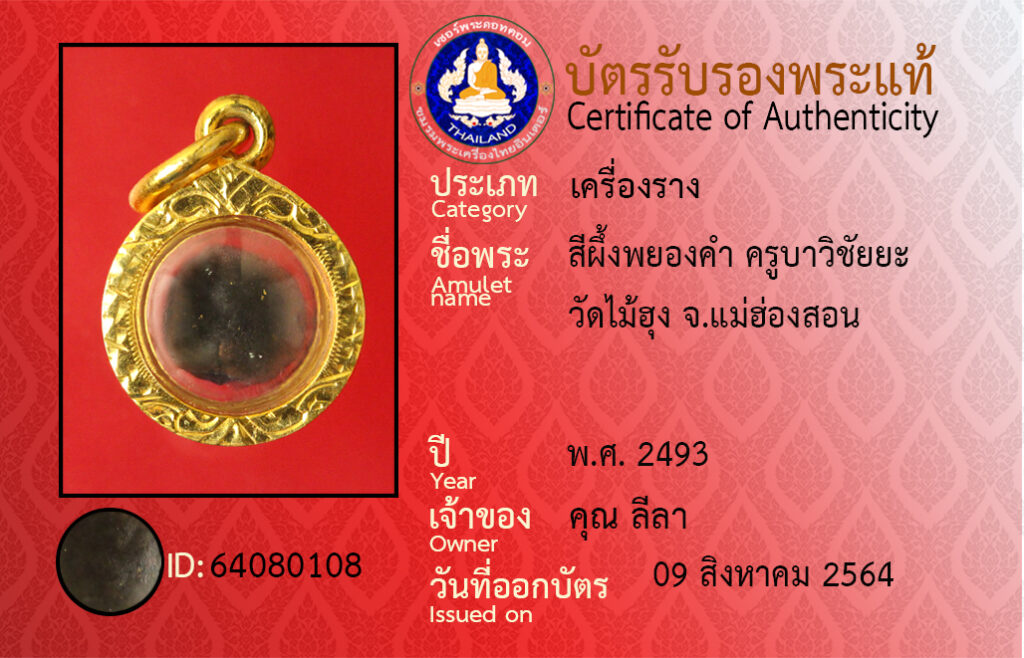 ชื่อพระ : สีผึ้งพยองคำ ครูบาวิชัยยะ วัดไม้ฮุง จ.แม่ฮองสอน
