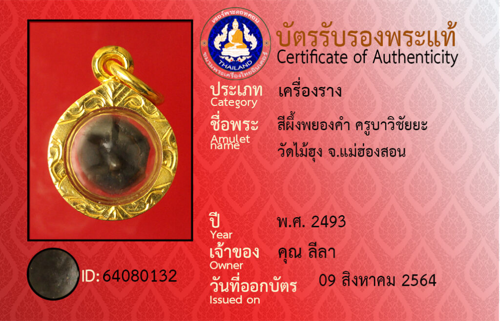 ชื่อพระ : สีผึ้งพยองคำ ครูบาวิชัยยะ วัดไม้ฮุง จ.แม่ฮองสอน