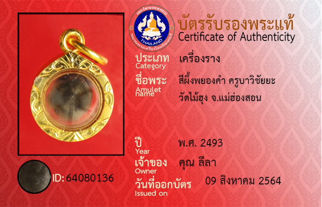 ชื่อพระ : สีผึ้งพยองคำ ครูบาวิชัยยะ วัดไม้ฮุง จ.แม่ฮองสอน