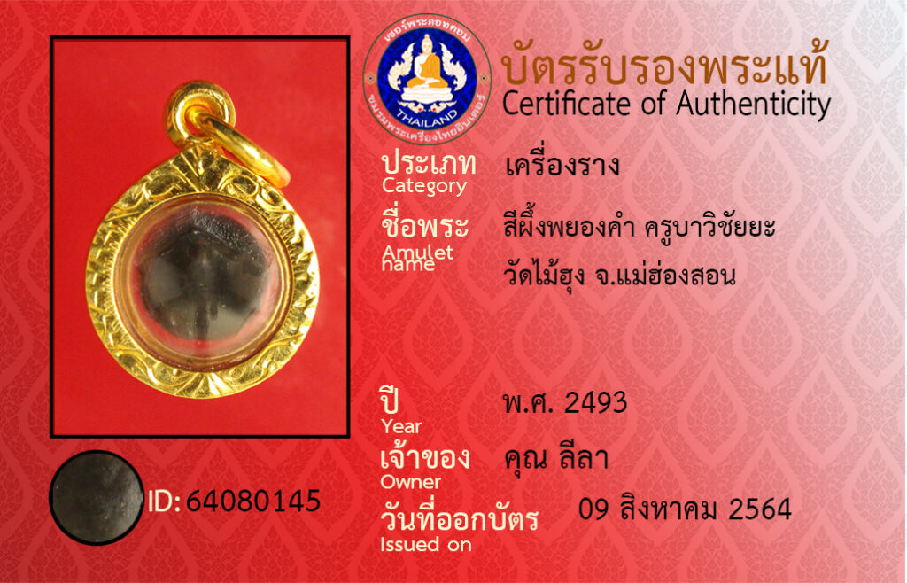 ชื่อพระ : สีผึ้งพยองคำ ครูบาวิชัยยะ วัดไม้ฮุง จ.แม่ฮองสอน