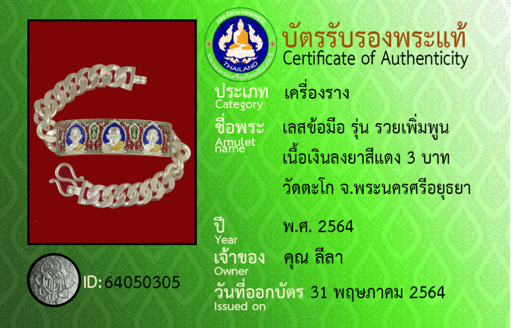 ชื่อพระ : เลสข้อมือ รุ่น รวยเพิ่มพูน เนื้อเงินลงยาสีแดง 3 บาท วัดตะโก จ.พระนครศรีอยุธยา