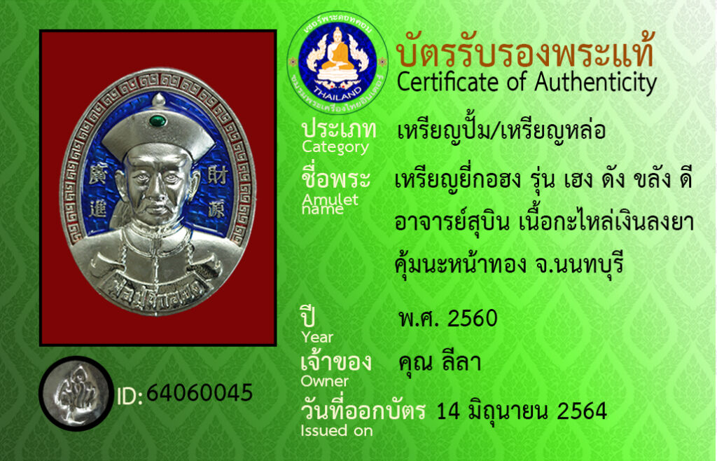 ชื่อพระ : เหรียญยี่กอฮง รุ่น เฮง ดัง ขลัง ดี อาจารย์สุบิน เนื้อกะไหล่เงินลงยา คุ้มนะหน้าทอง จ.นนทบุรี
