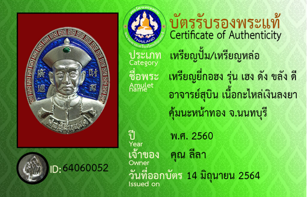 ชื่อพระ : เหรียญยี่กอฮง รุ่น เฮง ดัง ขลัง ดี อาจารย์สุบิน เนื้อกะไหล่เงินลงยา คุ้มนะหน้าทอง จ.นนทบุรี