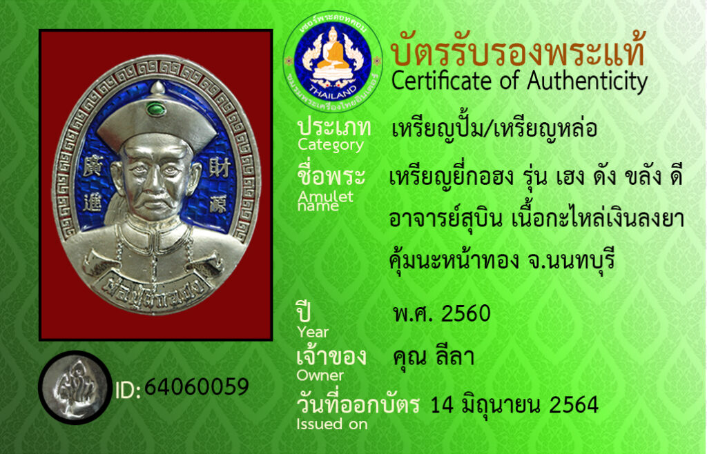 ชื่อพระ : เหรียญยี่กอฮง รุ่น เฮง ดัง ขลัง ดี อาจารย์สุบิน เนื้อกะไหล่เงินลงยา คุ้มนะหน้าทอง จ.นนทบุรี