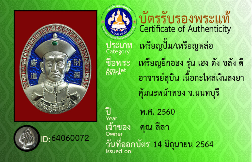 ชื่อพระ : เหรียญยี่กอฮง รุ่น เฮง ดัง ขลัง ดี อาจารย์สุบิน เนื้อกะไหล่เงินลงยา คุ้มนะหน้าทอง จ.นนทบุรี