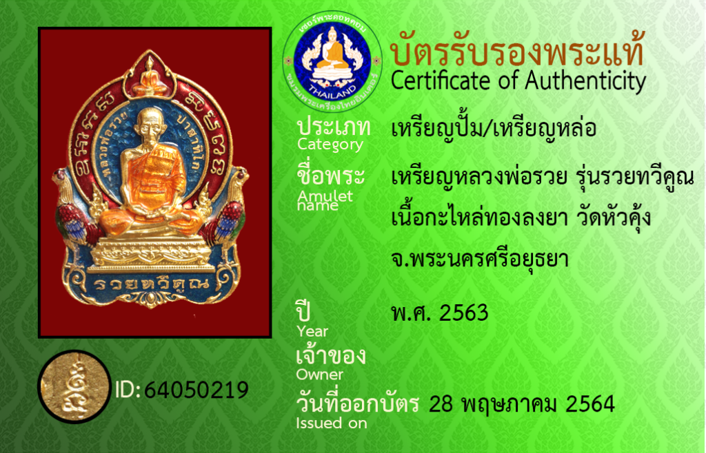 ชื่อพระ : เหรียญหลวงพ่อรวย รุ่นรวยทวีคูณ เนื้อกะไหล่ทองลงยา วัดหัวคุ้ง จ.พระนครศรีอยุธยา