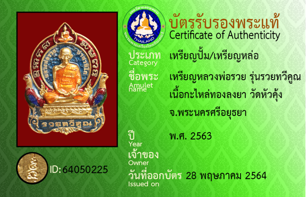 ชื่อพระ : เหรียญหลวงพ่อรวย รุ่นรวยทวีคูณ เนื้อกะไหล่ทองลงยา วัดหัวคุ้ง จ.พระนครศรีอยุธยา