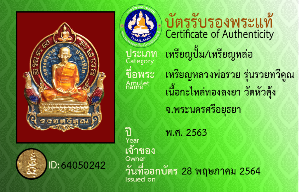 ชื่อพระ : เหรียญหลวงพ่อรวย รุ่นรวยทวีคูณ เนื้อกะไหล่ทองลงยา วัดหัวคุ้ง จ.พระนครศรีอยุธยา