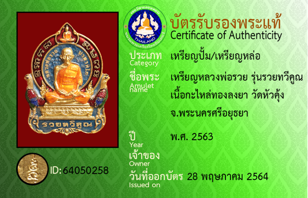 ชื่อพระ : เหรียญหลวงพ่อรวย รุ่นรวยทวีคูณ เนื้อกะไหล่ทองลงยา วัดหัวคุ้ง จ.พระนครศรีอยุธยา