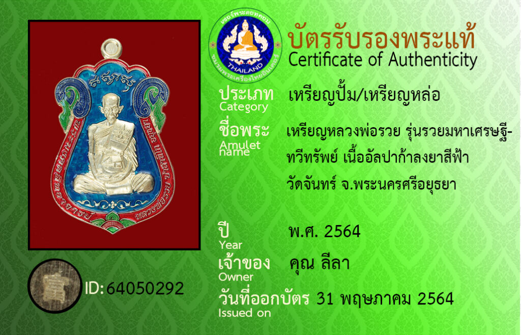 ชื่อพระ : เหรียญหลวงพ่อรวย รุ่นรวยมหาเศรษฐี- ทวีทรัพย์ เนื้ออัลปาก้าลงยาสีฟ้า วัดจันทร์ จ.พระนครศรีอยุธยา