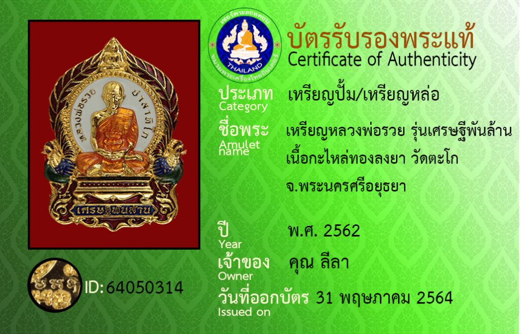 ชื่อพระ : เหรียญหลวงพ่อรวย รุ่นเศรษฐีพันล้าน เนื้อกะไหล่ทองลงยา วัดตะโก จ.พระนครศรีอยุธยา