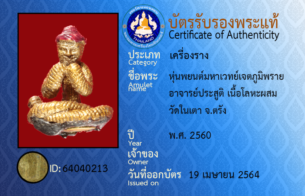 ชื่อพระ : หุ่นพยนต์มหาเวทย์เจตภูมิพราย อาจารย์ประสูติ เนื้อโลหะผสม วัดในเตา จ.ตรัง