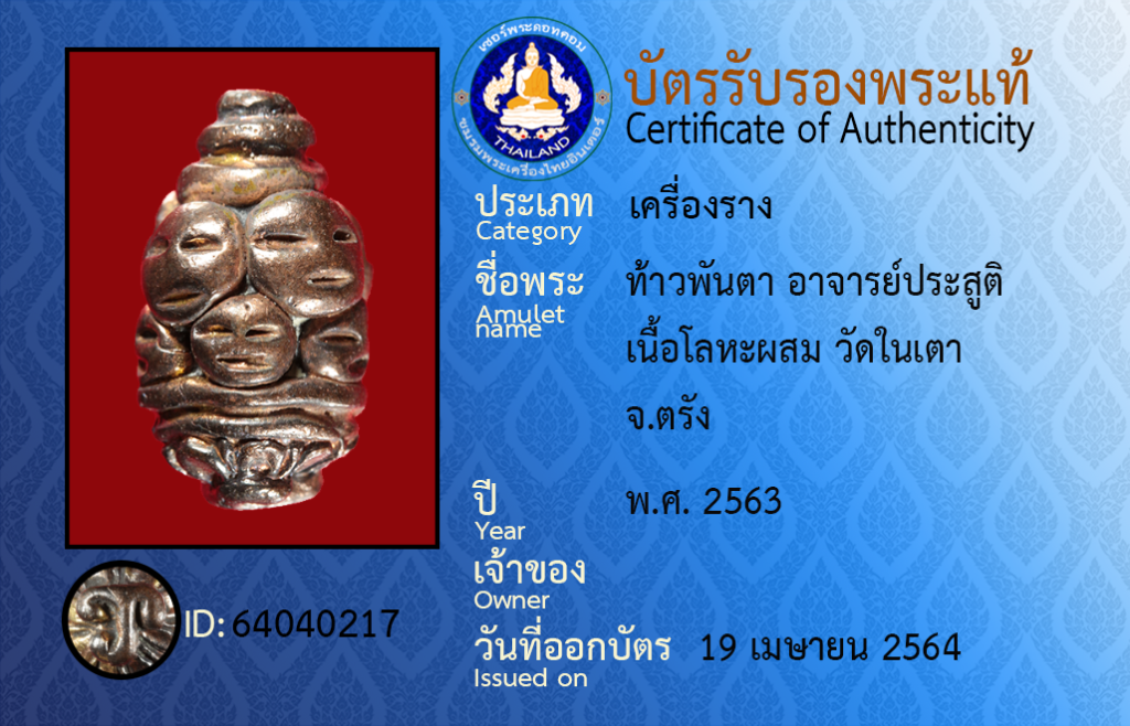 ชื่อพระ : ท้าวพันตา อาจารย์ประสูติ เนื้อโลหะผสม วัดในเตา จ.ตรัง