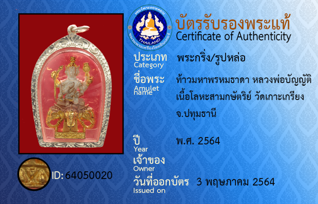 ชื่อพระ : ท้าวมหาพรหมธาดา หลวงพ่อบัญญัติ เนื้อโลหะสามกษัตริย์ วัดเกาะเกรียง จ.ปทุมธานี