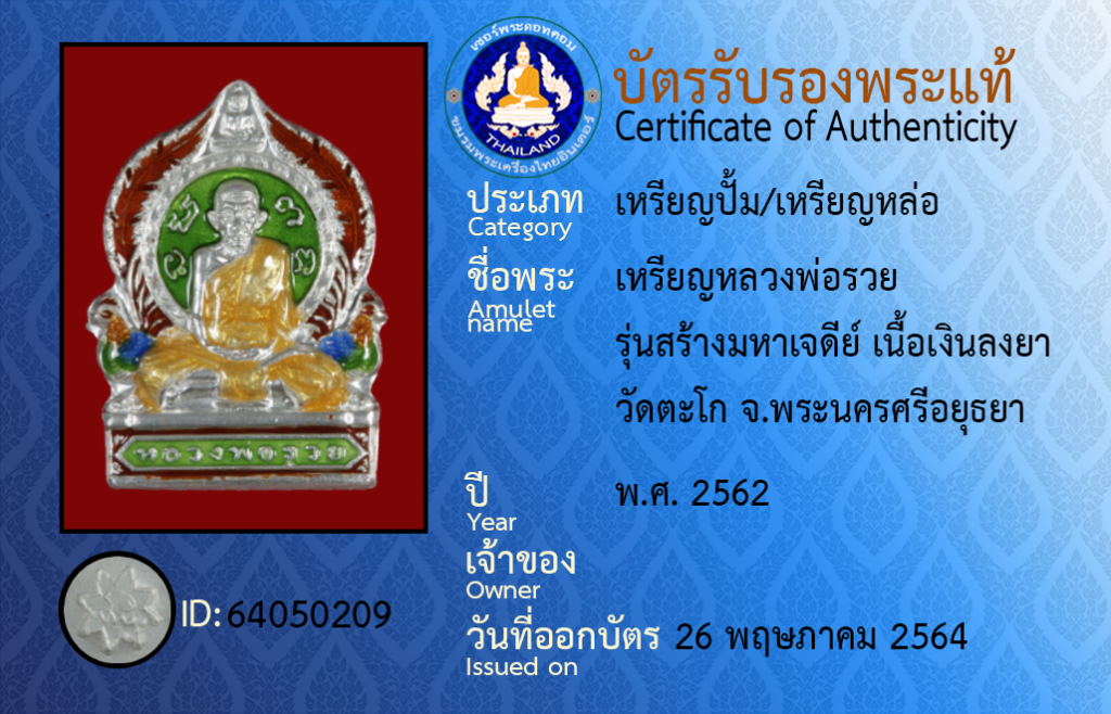 ชื่อพระ : เหรียญหลวงพ่อรวย รุ่นสร้างมหาเจดีย์ เนื้อเงินลงยา วัดตะโก จ.พระนครศรีอยุธยา