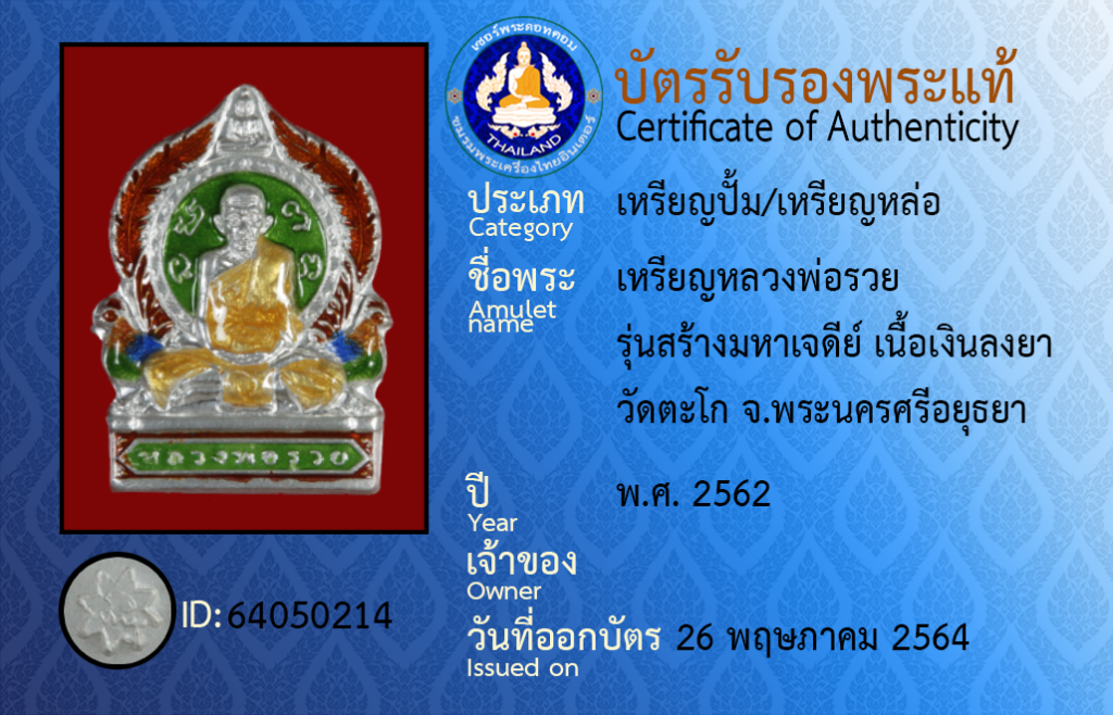 ชื่อพระ : เหรียญหลวงพ่อรวย รุ่นสร้างมหาเจดีย์ เนื้อเงินลงยา วัดตะโก จ.พระนครศรีอยุธยา