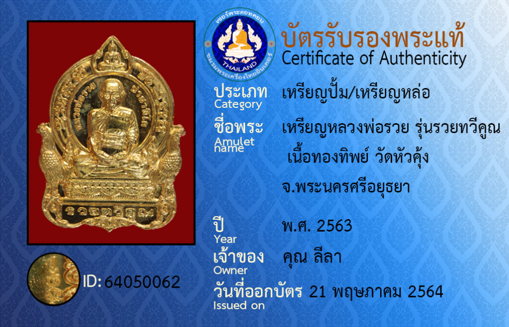 ชื่อพระ : เหรียญหลวงพ่อรวย รุ่นรวยทวีคูณ เนื้อทองทิพย์ วัดหัวคุ้ง จ.พระนครศรีอยุธยา