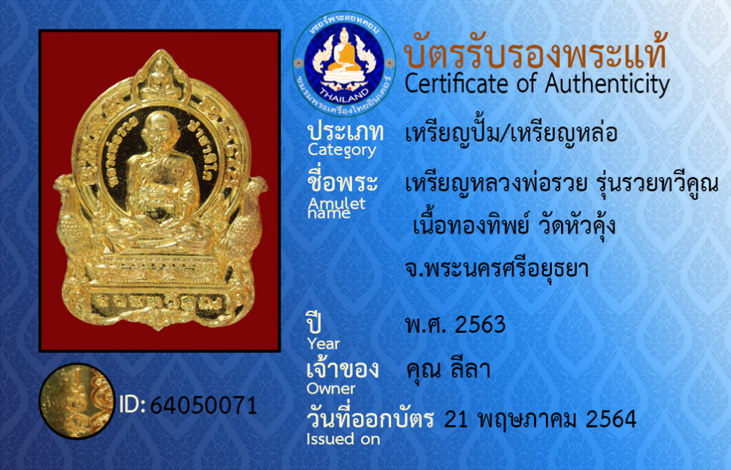 ชื่อพระ : เหรียญหลวงพ่อรวย รุ่นรวยทวีคูณ เนื้อทองทิพย์ วัดหัวคุ้ง จ.พระนครศรีอยุธยา