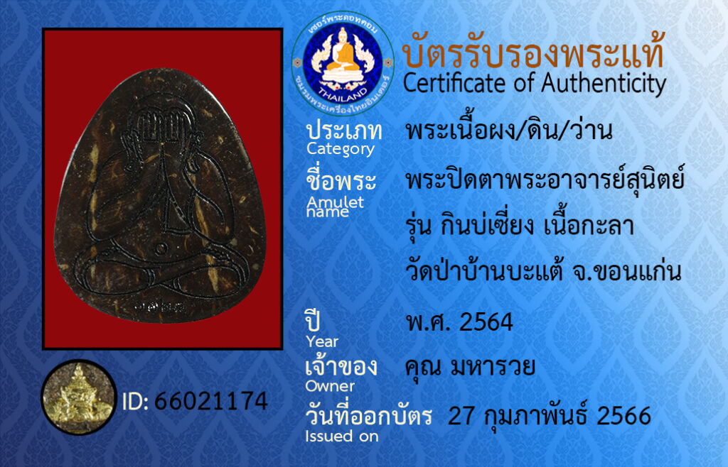 Amulet name : pra bpit dtaa pra aa jaan su nit run gin bor siang neua ka laa wat pa ban ba tae khon kaen