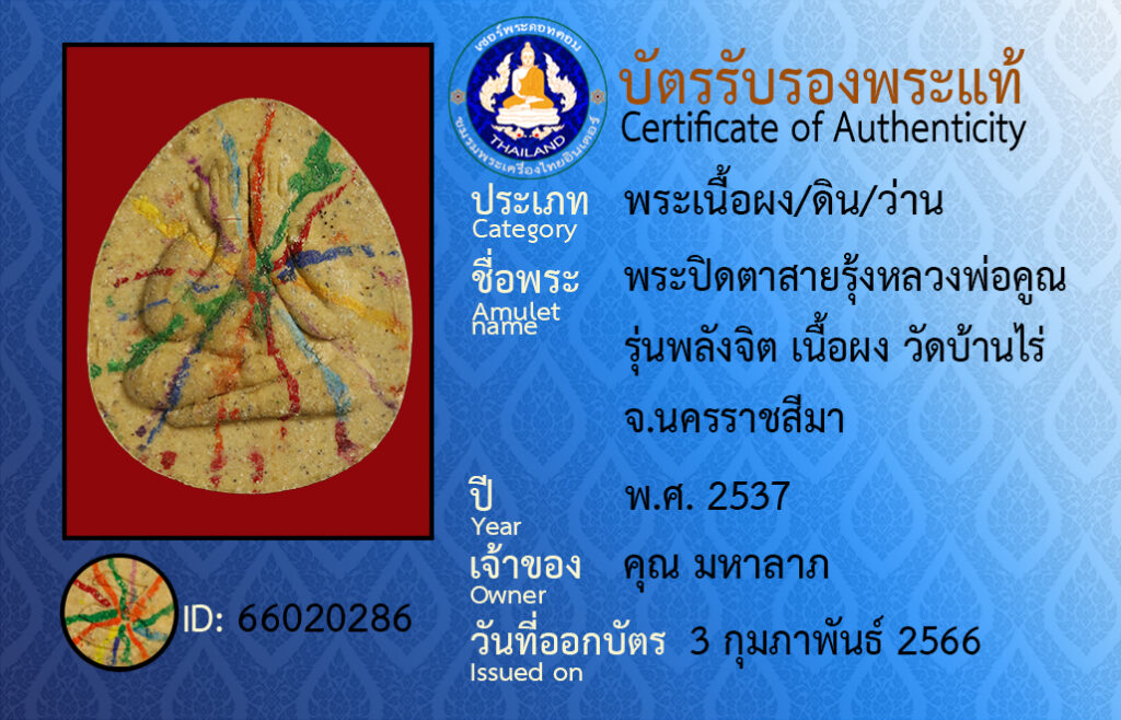 Amulet name :Phra pid ta sayrung luang por Koon run phalngcit neua pong Wat Ban Rai Nakhon Ratchasima
