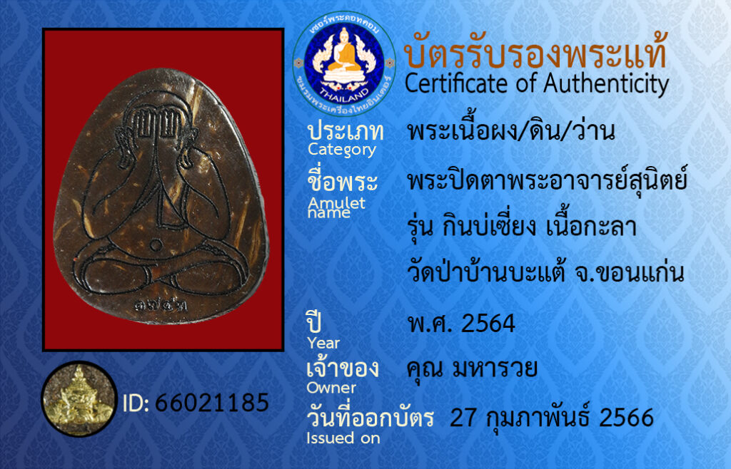 Amulet name : pra bpit dtaa pra aa jaan su nit run gin bor siang neua ka laa wat pa ban ba tae khon kaen