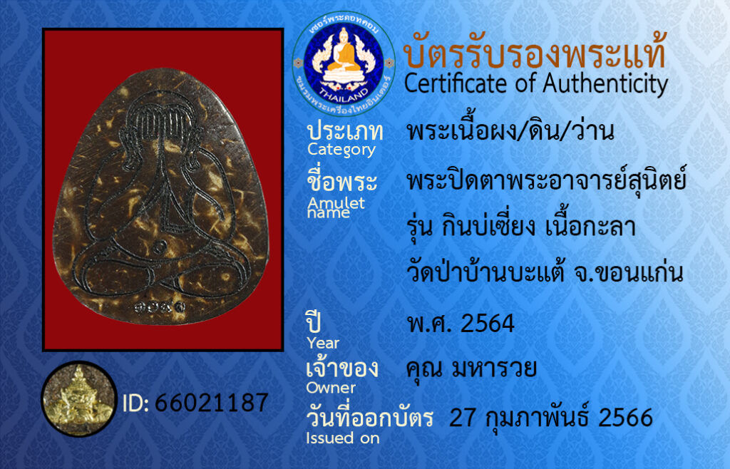 Amulet name : pra bpit dtaa pra aa jaan su nit run gin bor siang neua ka laa wat pa ban ba tae khon kaen