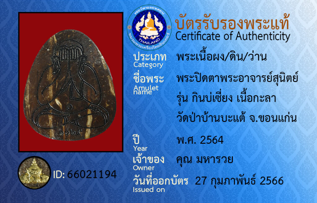 Amulet name : pra bpit dtaa pra aa jaan su nit run gin bor siang neua ka laa wat pa ban ba tae khon kaen