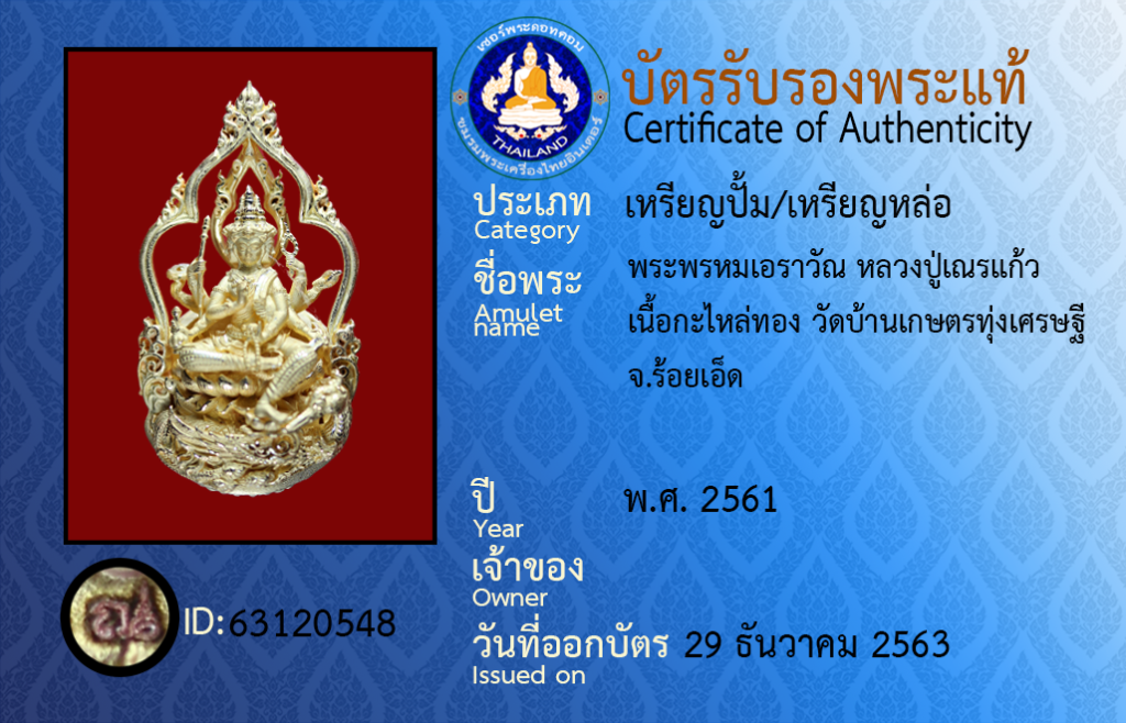 ชื่อพระ : พระพรหมเอราวัณ หลวงปู่เณรแก้ว เนื้อกะไหล่ทอง วัดบ้านเกษตรทุ่งเศรษฐี จ.ร้อยเอ็ด
