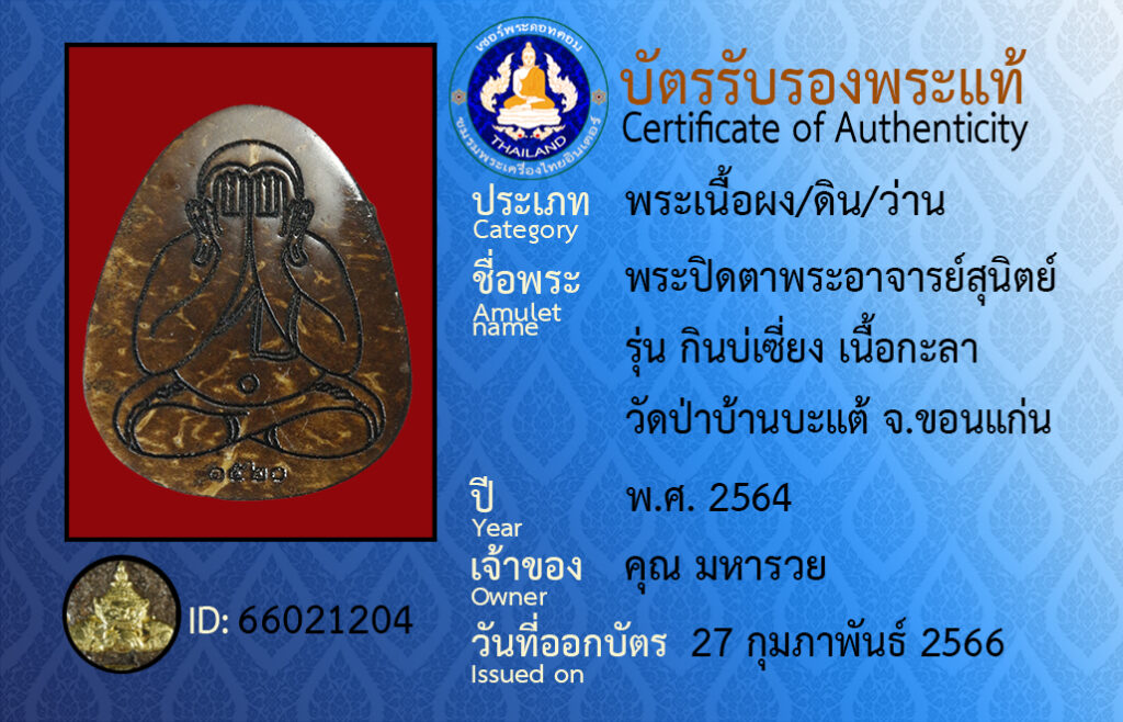 Amulet name : pra bpit dtaa pra aa jaan su nit run gin bor siang neua ka laa wat pa ban ba tae khon kaen